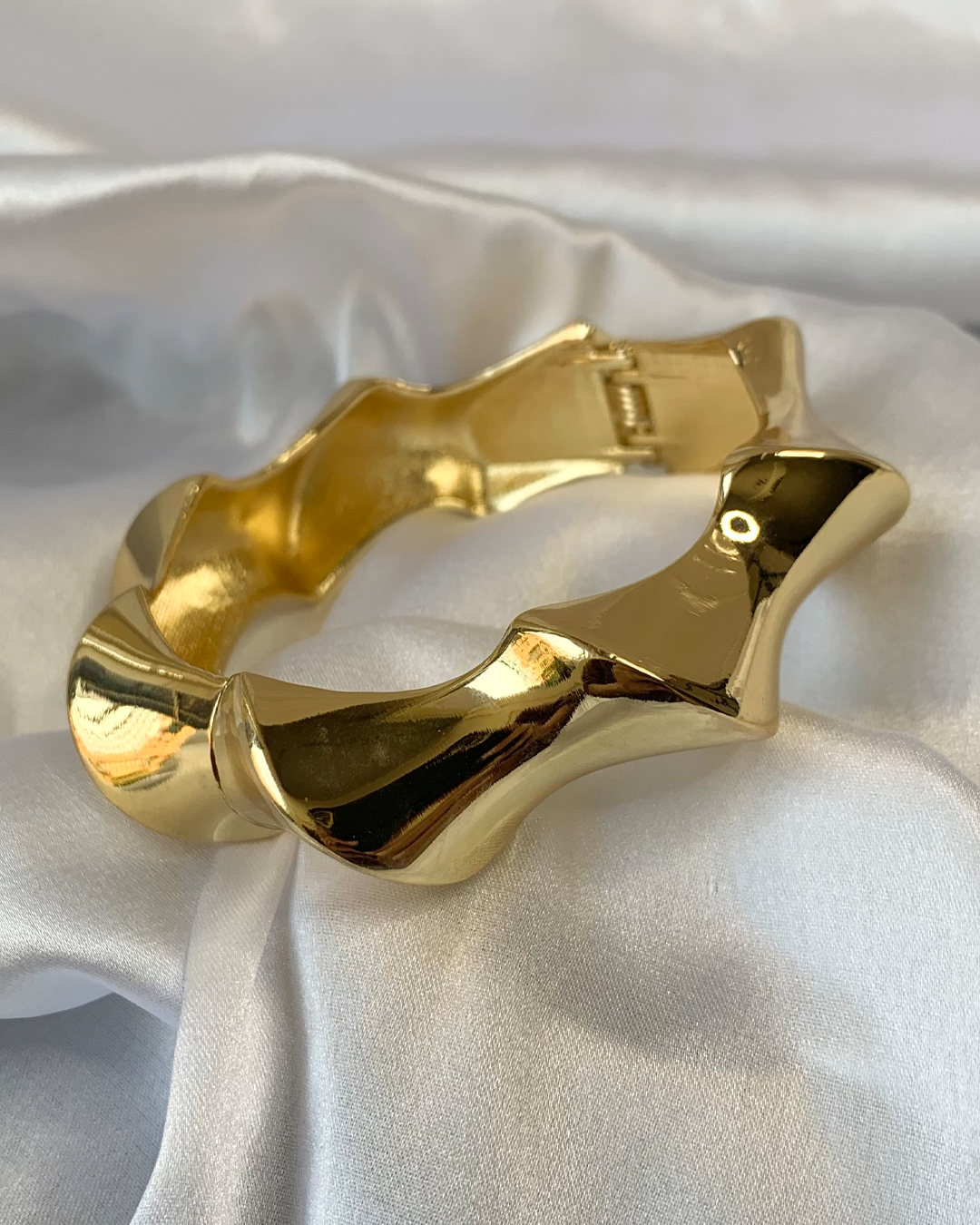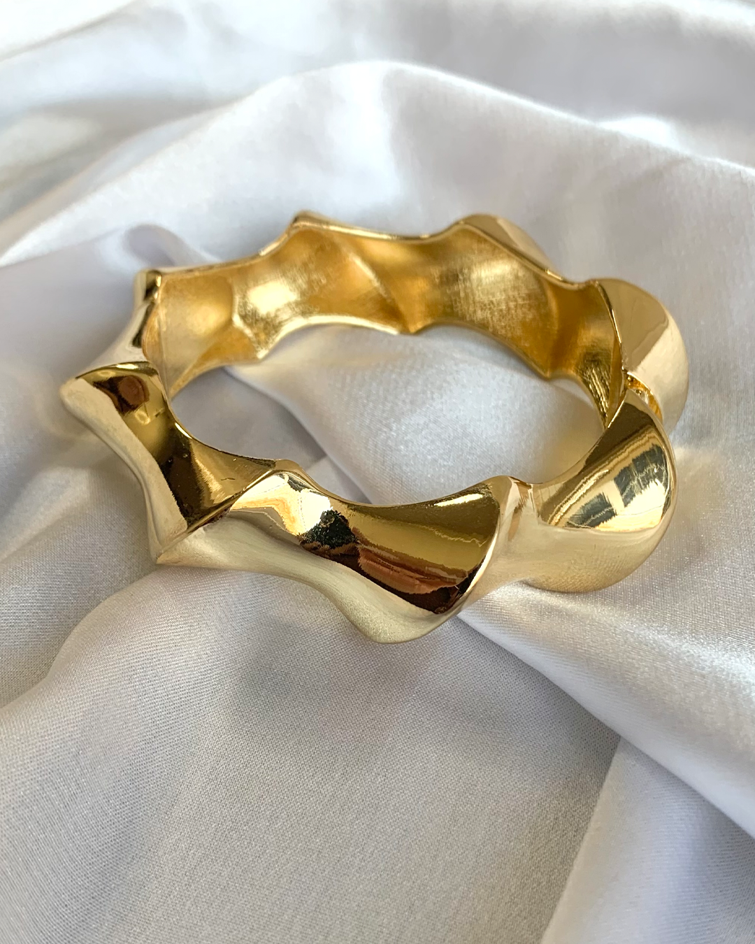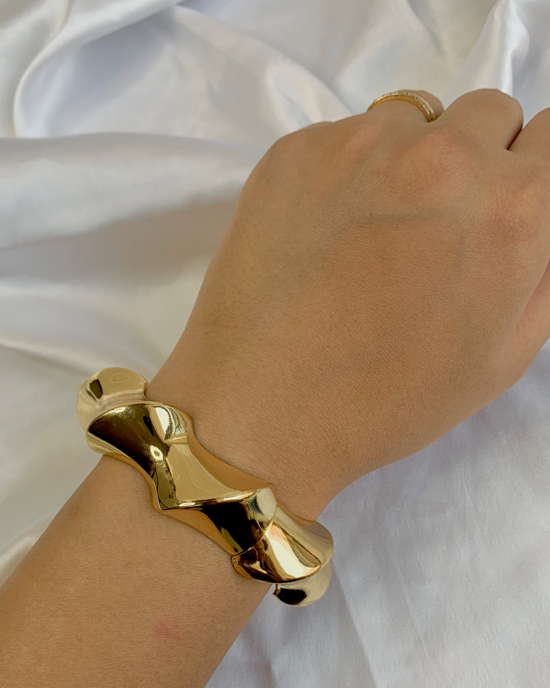 Embrace the elegance of our Croissant Curves Bangle, a stunning piece that captures the essence of modern artistry. Its unique twisted shape, reminiscent of a croissant, features soft edges that create a graceful silhouette. Perfect for layering or as a standout accessory on its own, this bangle embodies sophistication and versatility for any occasion.
