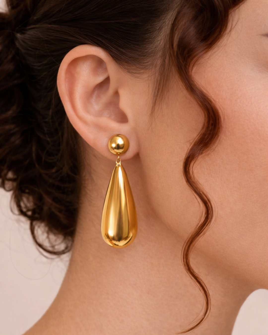Where elegance meets edge the Molten Drop Earrings are inspired by the natural flow of molten gold. With their smooth, droplet design and mirror-like shine, they bring a touch of effortless drama to your look. Anti-tarnish, waterproof, and crafted to last these statement earrings are your go-to for every mood, from brunch to night-out glam.