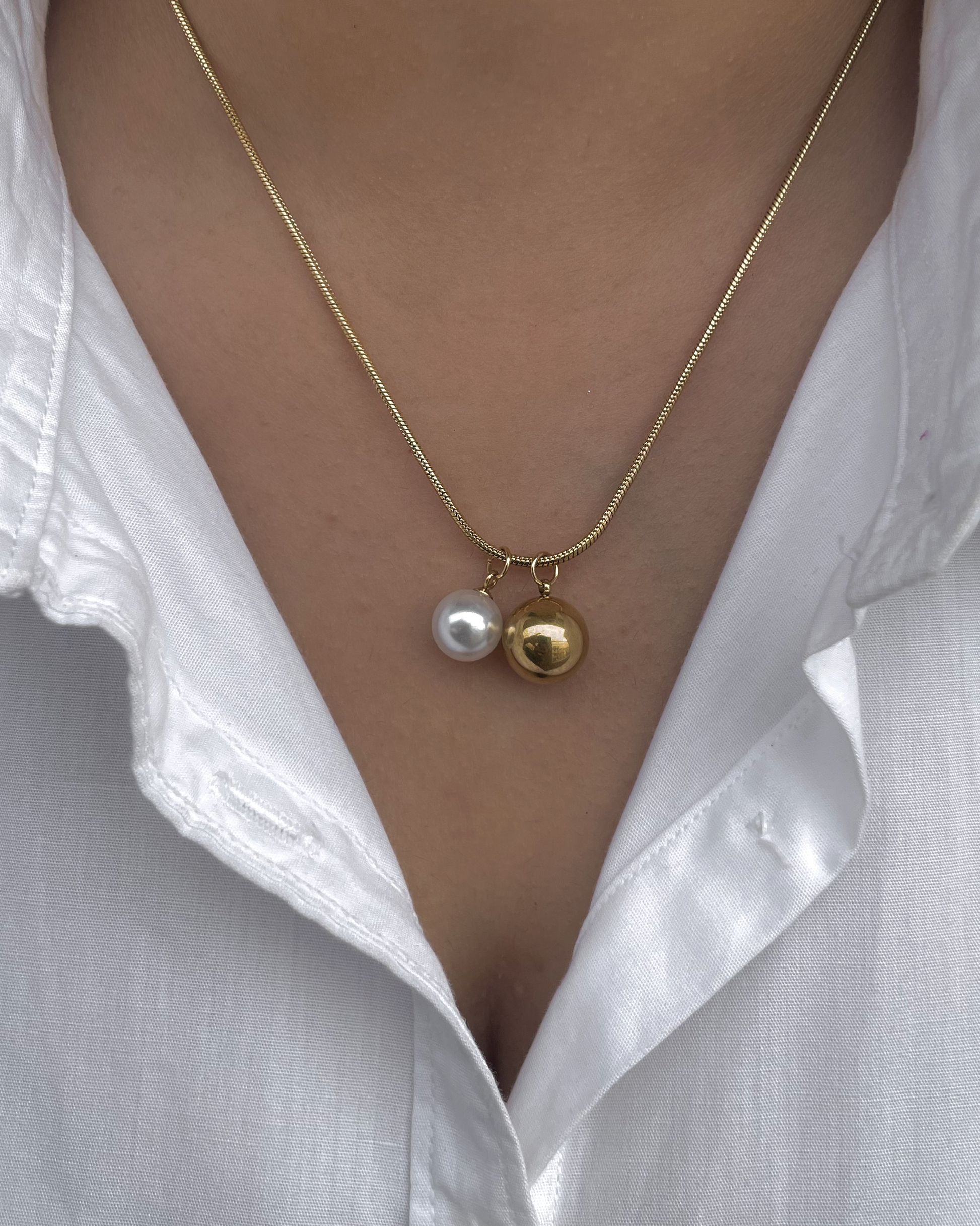 Introducing our elegant pendant with chain, showcasing two exquisite elements: a radiant pearl droplet and a gleaming golden droplet. This design blends classic sophistication with modern charm, offering a versatile accessory that adds a touch of grace and luxury to any attire. Ideal for those who appreciate the beauty of contrasting textures and timeless elegance.